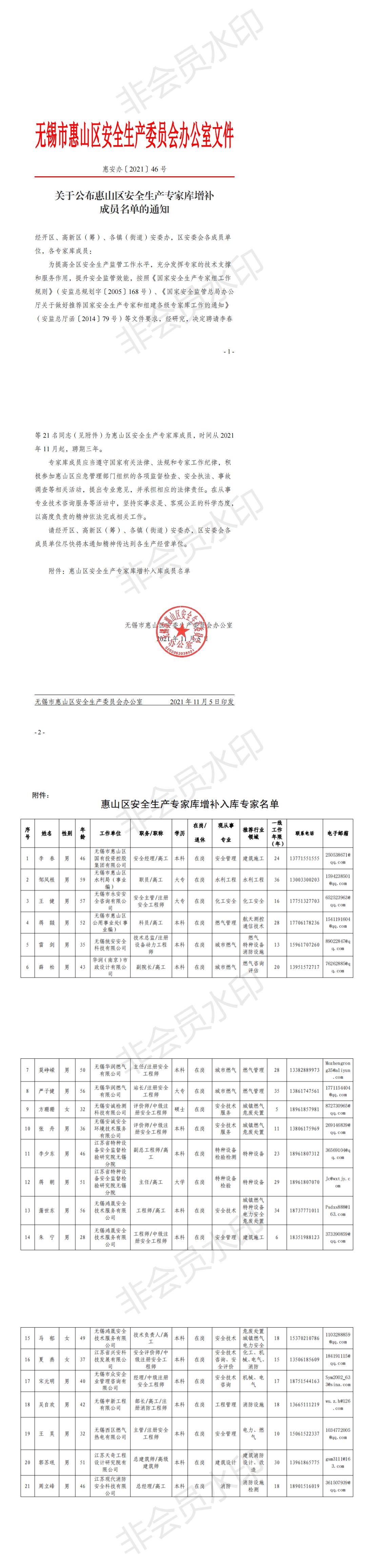 關(guān)于公布惠山區(qū)安全生產(chǎn)專家?guī)煸鲅a(bǔ) 成員名單的通知